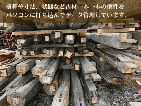 弊社では古材一本一本の入手地・樹種・サイズ・写真をパソコンで管理し、クラウド上にデータを保存。古材一本につき、1ページのウェブページをご用意しております。