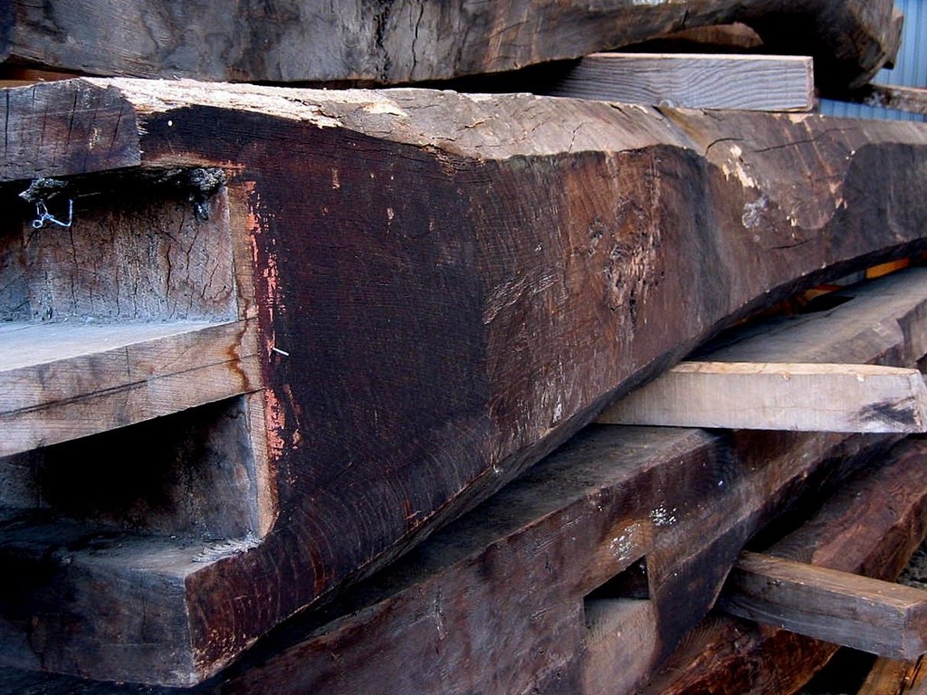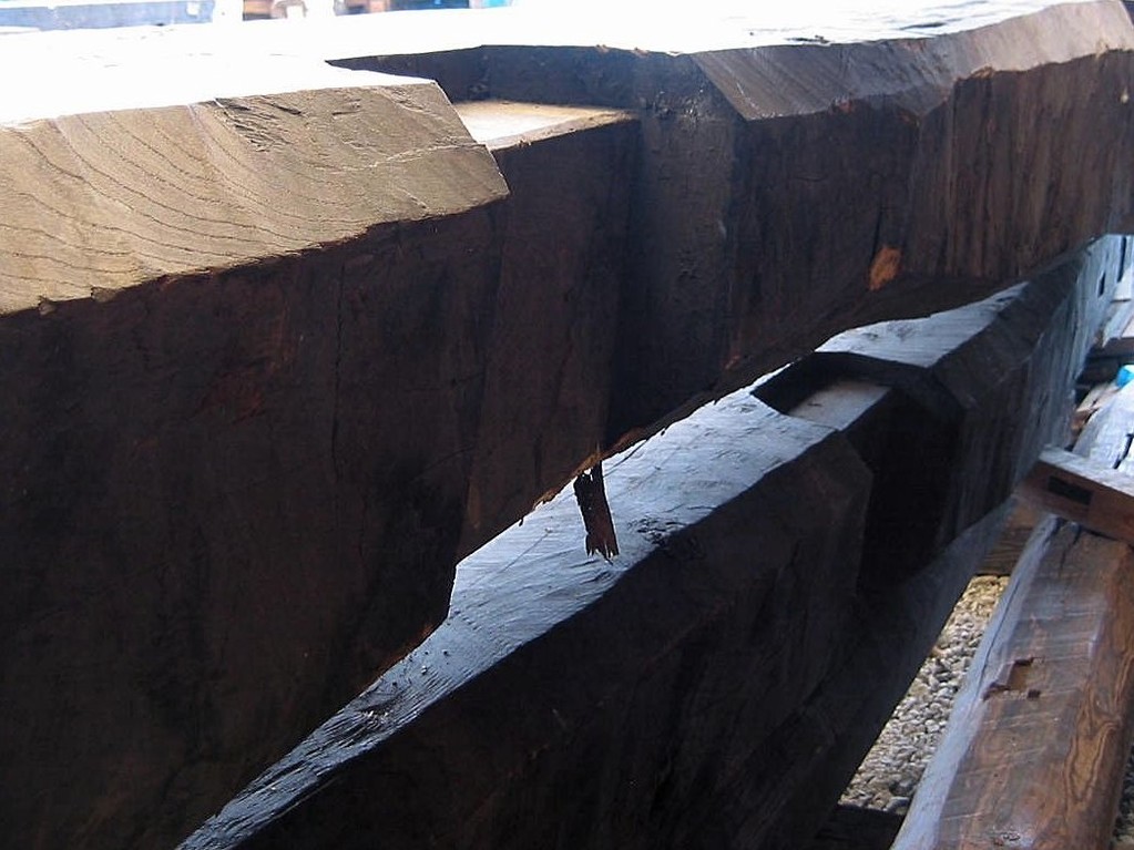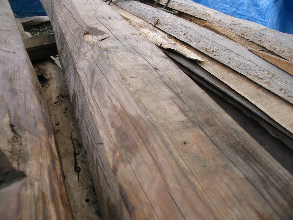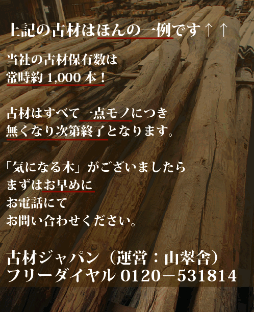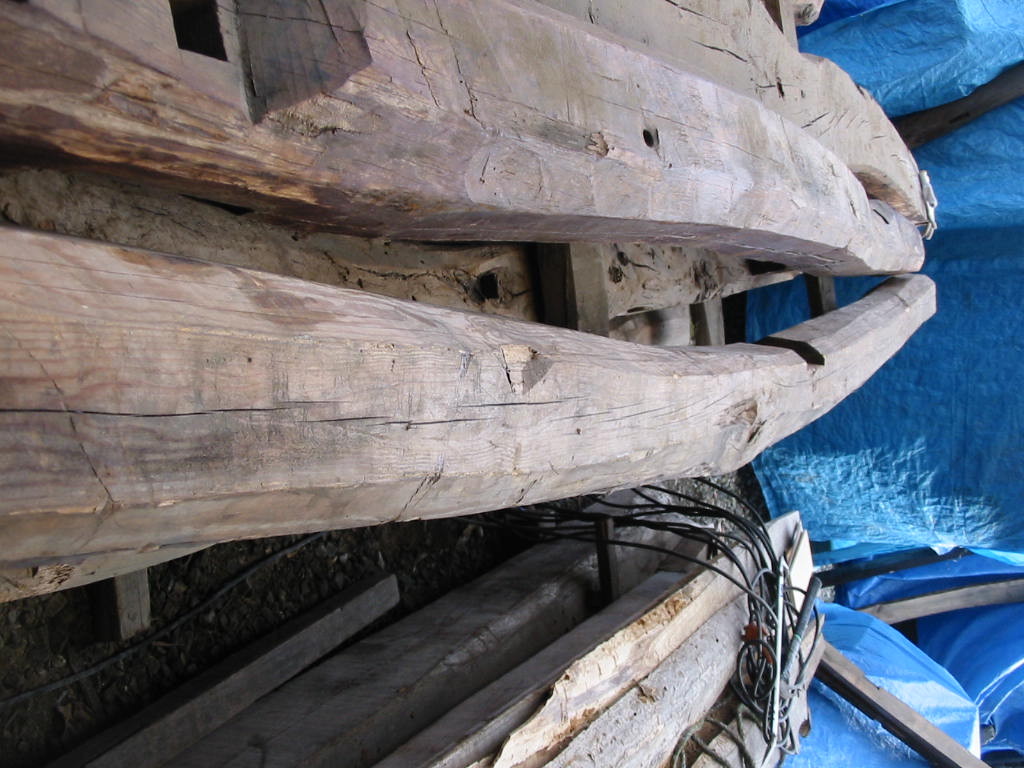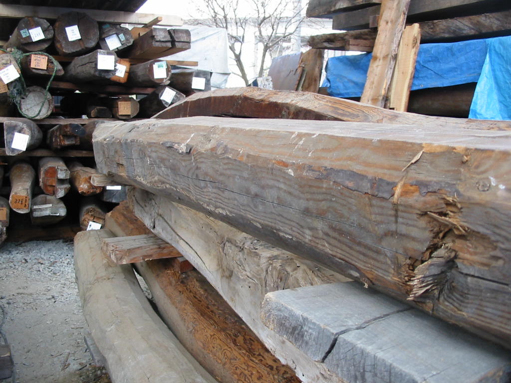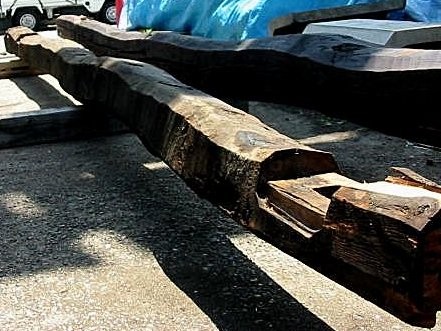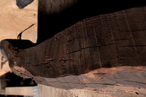 古民家における梁材です。ウネウネと曲がり、手斧の跡が随所に残る、この部材こそ“ザ・古民家”!梁材には松が好んで使われています。松は強度があって粘り強く、密度が高いので、建物の上からの荷重を支える上で好都合。まさに適材適所なのです。黒く燻されて真っ黒くなった梁材は貫禄充分!いいですねえ!