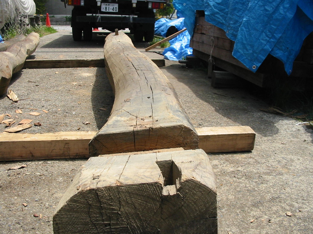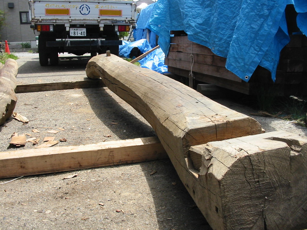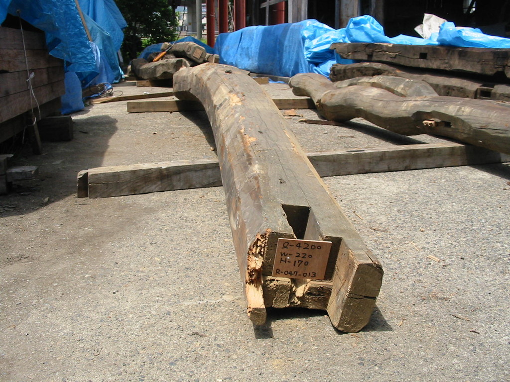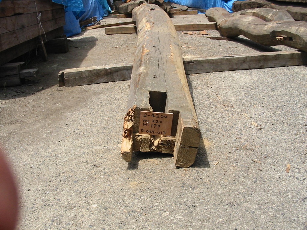 当初は、移築再生用に手ばらしで解体したもの。その後、再び移築されることなく、古材を当社が引き取ることになりました。二度とお目にかかれないような巨大なケヤキの梁。まずはご堪能下さい。