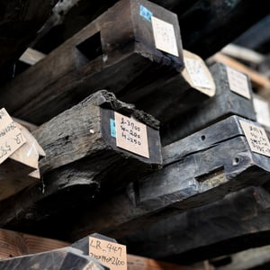 古材一本一本のサイズや形状・樹種をラベルで監理し、お客様からのご質問等に迅速に対応できるようにしております。